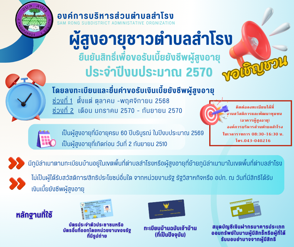 ขอเชิญชวนผู้สูงอายุชาวตำบลสำโรง ยืนยันสิทธิ์เพื่อข...
